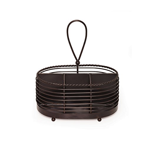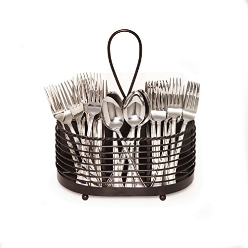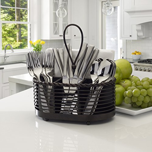Studio : Pfaltzgraff Publisher : Pfaltzgraff Binding : Kitchen Product Description This Pfaltzgraff rope twist antique Black wire flatware caddy is an attractive and convenient way to keep utensils and napkins neat and organized at dinner gatherings. Handcrafted from wrought iron for long-lasting beauty even under rigorous use, this caddy features 3 compartments for flatware and one for napkins, plus a carrying hoop, and is accented with a rope twist design around the rim. The wire frame structure makes it easy to identify forks, knives, and spoons within each compartment. Measures 11-1/2 x 10 x 6-1/2 inches. Wipe clean with a soft, damp cloth. 0