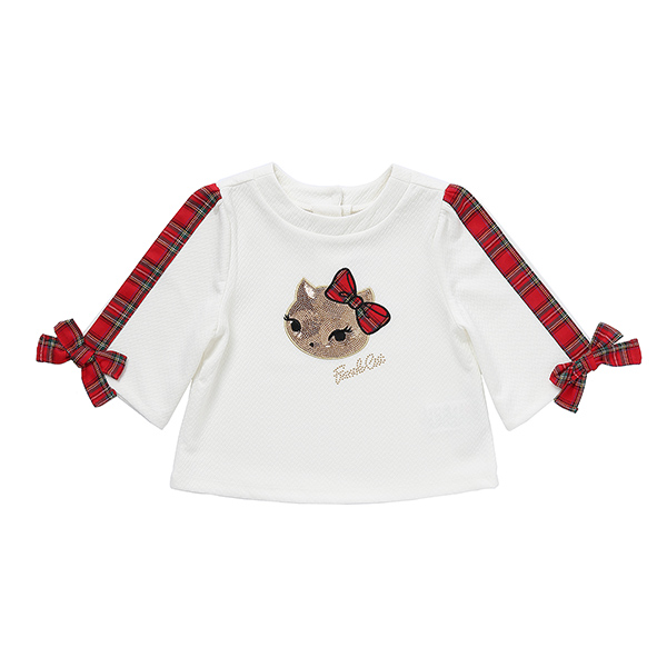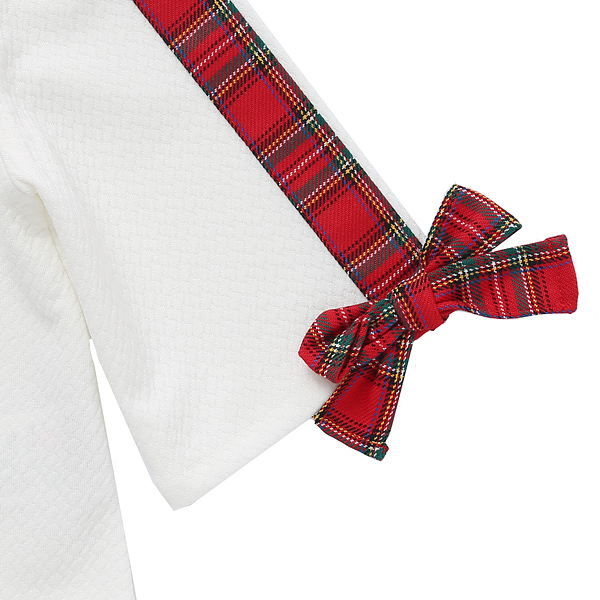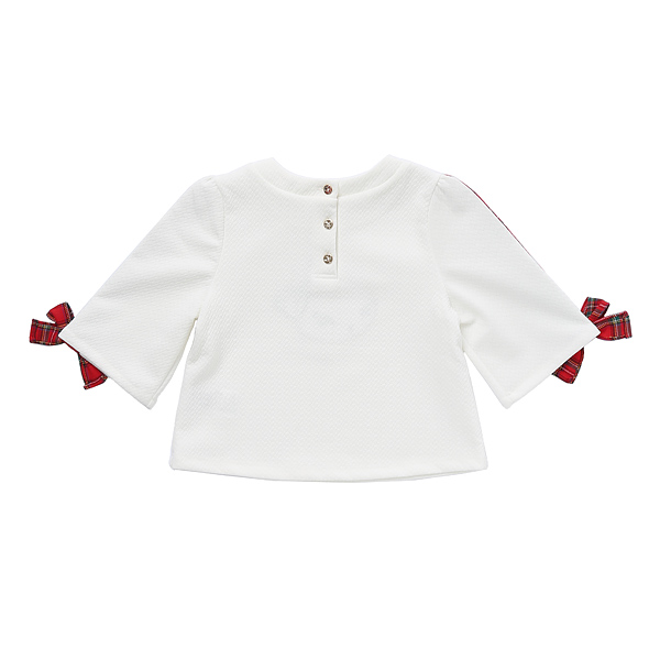 상품설명 화이트 컬러의 7부 소매의 탑입니다. 소매에 체크배색과 리본장식이 멋스럽습니다. 간절기에 한겹만 입고 쌀쌀해지면 긴팔티셔츠와 코디하셔도 좋습니다. 어떠한 하의와도 코디가 좋습니다.