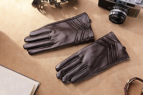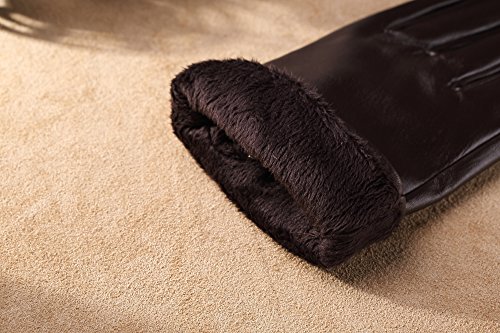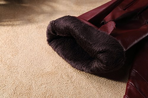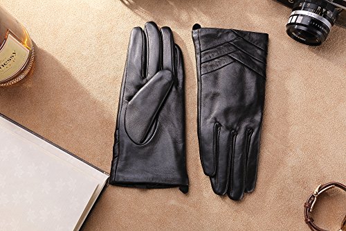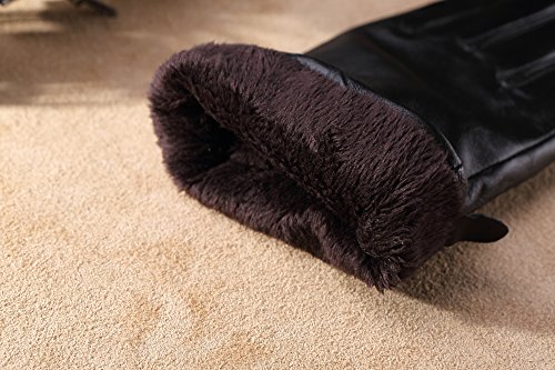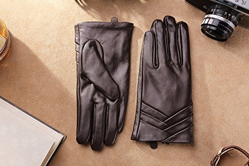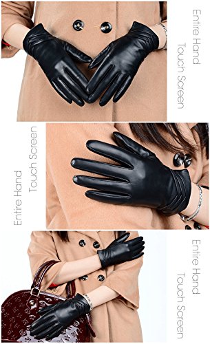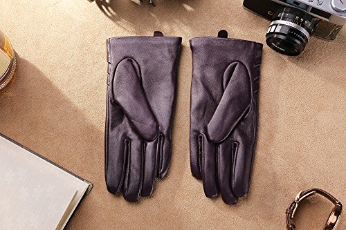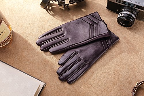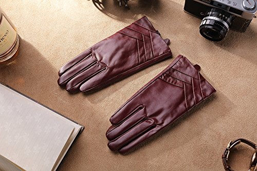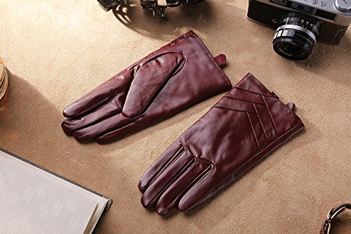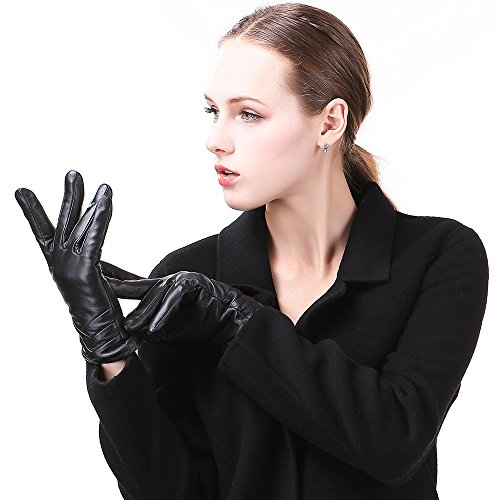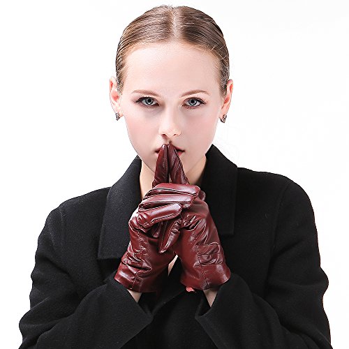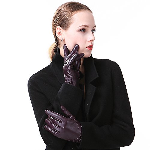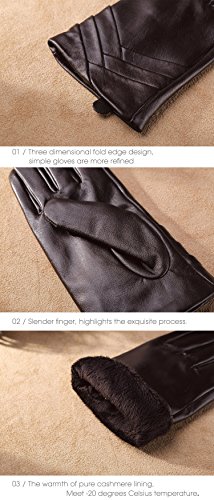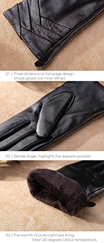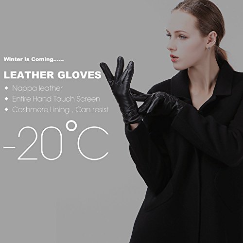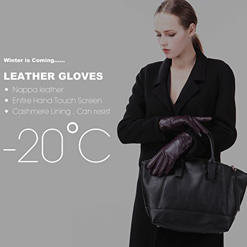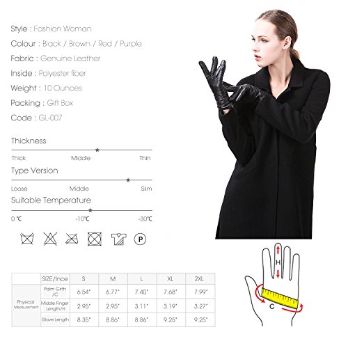 1. If there are scratches or stains on the surface, you can coat it with a little hand cream and then use a soft cloth to wipe it. Then it will be renewed. 2. There may be a bit leather smell when get the gloves, since it's a new unused leather product. You could open the package and put it in a ventilate place for a few days, then the smell will fade away.? 3. As genuine leather gloves, it will become brighter and brighter over time.? 4. Prevent it from water, moisture and especially alcohol or products contained alcohol. Size Chart: Measurement for women gloves: Size S= 6.5" - Middle finger = 2.95" Size M= 6.8" - Middle finger = 2.95" Size L = 7.4" - Middle finger = 3.11" Size XL= 7.7" - Middle finger = 3.19" Size 2XL= 8.0" - Middle finger = 3.27" Material: 100% ITALIAN NAPPA TOP GENUINE LEATHER? Lining: 100% PURE CASHMERE LINING? Color: BLACK/BROWN/PURPLE/RED? Don't do this: 1. Rub on sharp or rough objects 2. Place under the sun directly 3. Dry it with a hair dryer