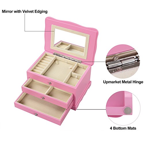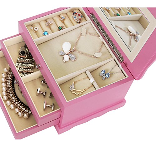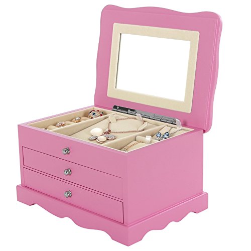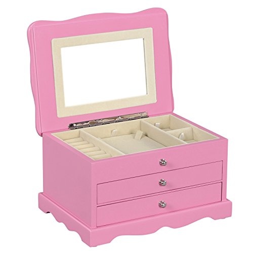 SONGMICS Girls Jewelry Box Pink Wooden Case Organizer with Mirror UJOW03P