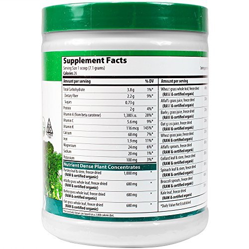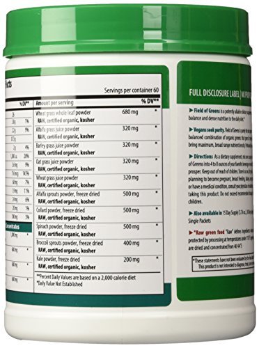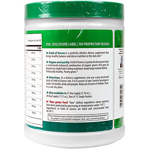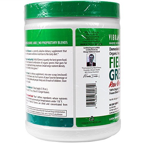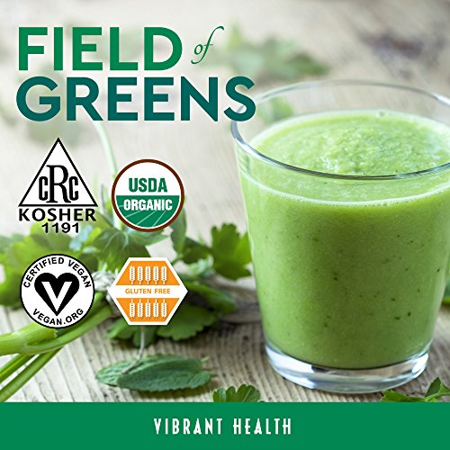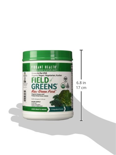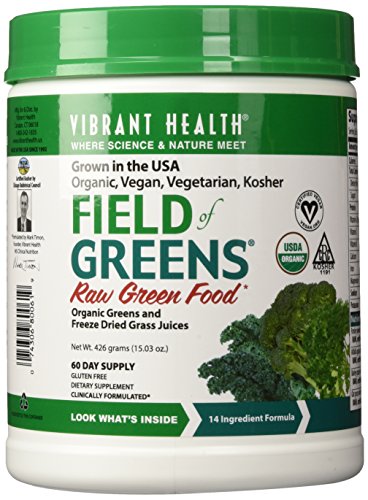 Studio : Vibrant Health Publisher : Vibrant Health Binding : Health and Beauty Product Description 100% certified organic raw greens, Kosher, vegan, raw food supplement. Field of Greens is a collection of organic, Kosher, raw green foods that sets a new standard in green food nutrition, supporting immunity, and overall health. Vibrant Health's Field of Greens sets a new standard for purity and healthful goodness among purely green foods. Field of Greens is the benchmark green food product for anyone seeking an organic, purely green food with MAXIMUM nutritional value. It is potently alkalinizing. Use it as part of your best detox cleansing diet program. Vibrant Health has assiduously sought the absolute highest quality green food ingredients. New technologies have been brought to bear on the components of Field of Greens so that full nutrition can be delivered. Each food is processed in the gentlest manner possible, and dried at the lowest temperature ever employed in this industry. That means each ingredient is a truly raw food. Full nutrition from the best greens from the best organic farmers in the United States flows into each jar of Field of Greens and then out to you each time you use it. Field of Greens is not just wheat grass or wheat grass juice powder, and not just barley grass either. It is a unique combination of the best green foods that can grow from organic soil. And that's important. Stir up some Field of Greens in water to reconstitute the best possible purely green drink. Use it to fortify your morning smoothie, turning it into a green superfood. Add nutrition from Field of Greens to the best detox diet plan. Vibrant Health and its suppliers have gone one step further in the use of certified organic ingredients. We have taken great care to dry and process each ingredient at the lowest possible temperature in order to preserve as much of the full nutrient value of the plant in its raw state. Field of Greens can be an excellent addition to any raw food diet. 0