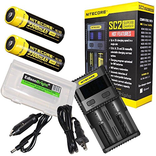 -. Title : Nitecore SC2 Superb Charger bundle: Fast charger and two NL183 Li-ion 18650 rechargeable batteries with EdisonBright brand BBX3 Battery case