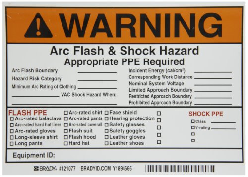 Brady 121077 Vinyl Write-On Arc Flash & Shock Labels (Warning) , Black/Orange On White, 5" Height x 7", Legend "Warning Arc Flash & Shock Hazard Appropriate Ppe Required Flash Hazard Category____..., Etc." (5 Labels per Package)