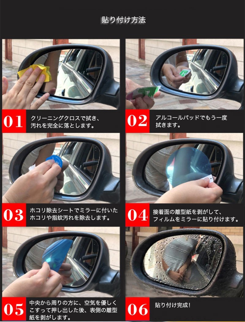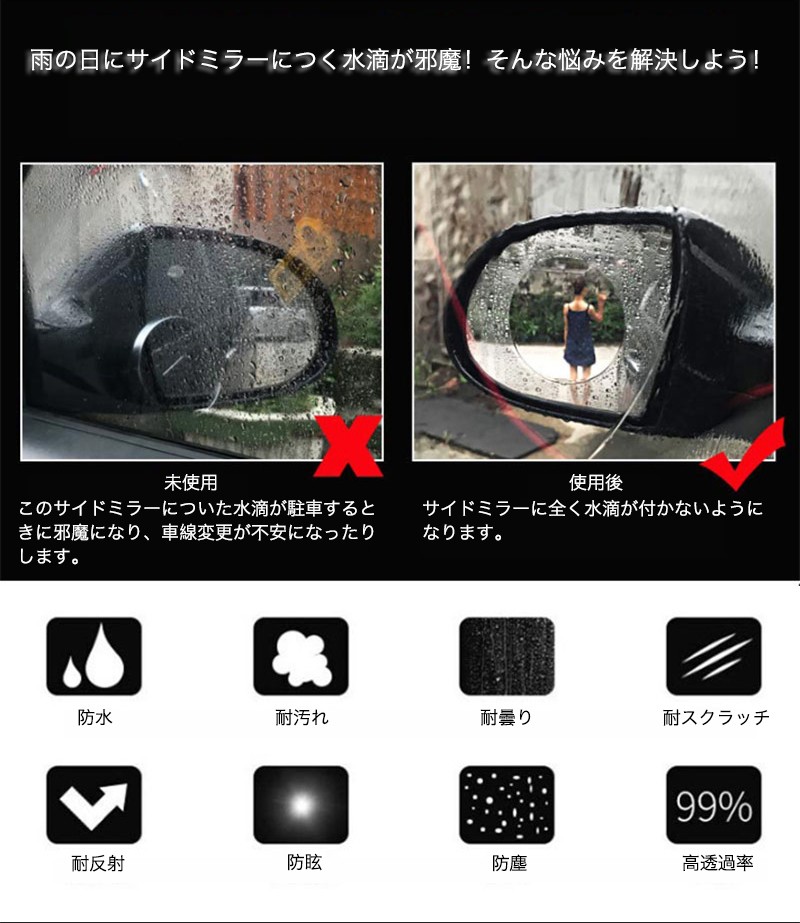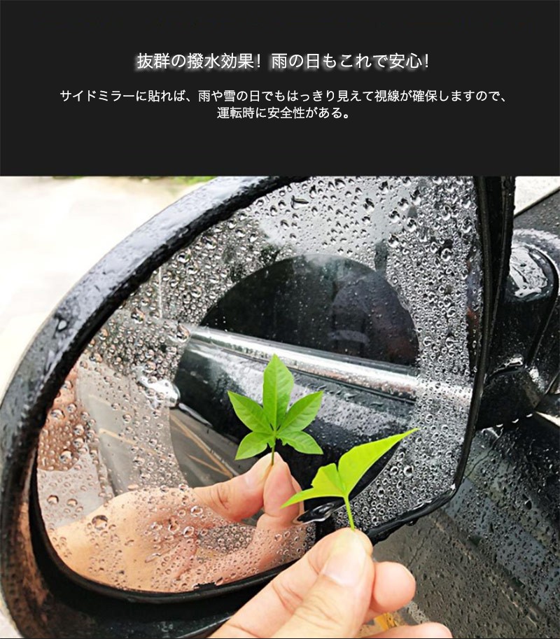★「商品特徴」雨の日にサイドミラーにつく水滴が邪魔!そんな悩みを解決しよう!高透過率を持ちながら、汚れにも強く。撥水加工により、フィルム上に付いた水滴が簡単に落ちます。サイドミラーに貼れば、雨や雪の日でもはっきり見えて視線が確保しますので、運転時に安全性がある。★「キーワード」ドアミラーフィルム サイドミラー 撥水フィルム 高透過率 視線確保 多層コーティング 表面処理 ナノコーティング 安全性