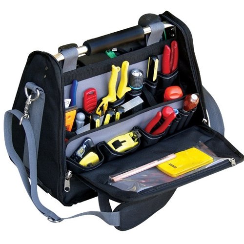 - Tool tote bag includes snap hook and adjustable front webbing holds level or blueprints