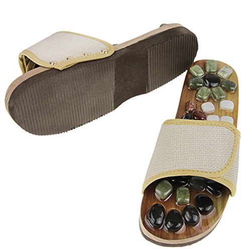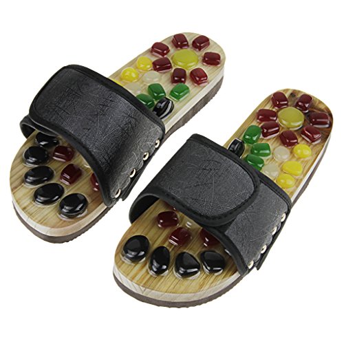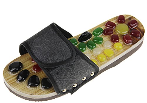 1. Material: rubber sole, silicone massage buttons, breathable adjustable surface. 2. US Size: Men (6-7)/ Women (7-8.5) and Men (8.5-9)/ Women (10-10.5) 3. According to human engineering, the massage slippers are designed with scientific acupoint, totally 70 massage buttons composite a foot shape, stimulating foot vital point. 4. They work also for Arthritis and headaches. 5. Apparently, it's precisely the initial discomfort that signifies just how much you need them and which areas of the body require a little work. 6. Reduces stress and tension in neck and shoulders; Reflexology /Acupuncture therapy effortlessly and inexpensively everyday!