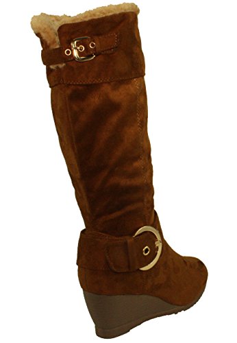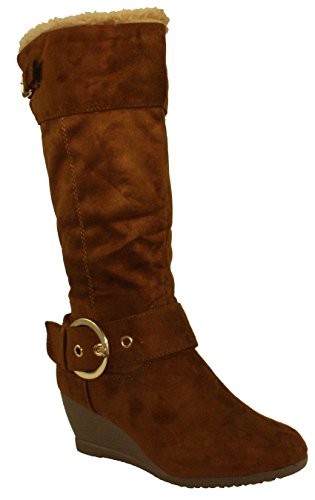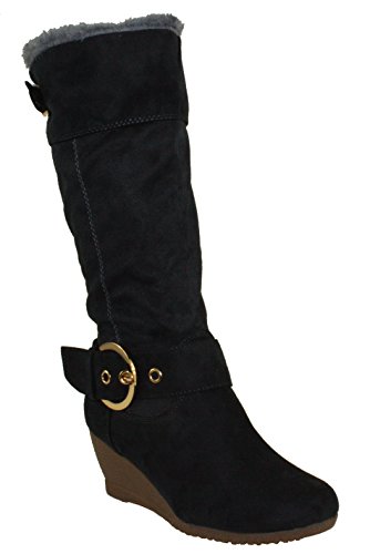 Product DescriptionWomen's mid-calf wedge heel boots, faux suede upper, mid-height wedge heels, buckle decor, faux fur lining, half length side zippers for easy on and off.0