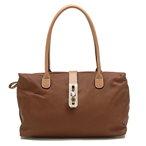 Made from polyester nylon fabric with synthetic leather trim and silver-tone hardware. Dual carrying handles. Center top flap with twist lock over zip top closure. Fully lined fabric compartment. Interior zip and slip pockets. BEFORE PURCHASING, PLEASE COMPARE THE SIZE OF THIS HANDBAG TO ONE OF YOUR OWN FAVORITE BAGS.Feature