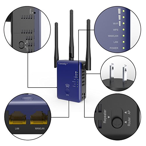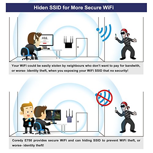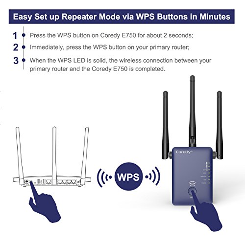 Dual Band WiFi throughout your home!Coredy E750- eliminating Wi-Fi dead zones with super fast dual band WiFi! Small size with superior performance and reliability, mode switch button and signal indicator lights for easier setup, WiFi speed up to 5GHz 433Mbps + 2.4 GHz 300Mbps.Multiple Functions:WiFi Range Extender(Repeater)- Extend WiFi coverage and improve the signal strength of existing wireless networkWireless Access Point- Covert a wired network to a wireless networkWireless Ac Router- Create an instant private wireless Ac networkSuperior Performance, Reliable Dual Band WiFi 5GHz 433Mbps + 2.4 GHz 300Mbps, More Choices for You!Adopt the MediaTek solution for superior performance and reliability, 3 x 3dBi external antenna for stronger WiFi signal and wider coverage.Recommend you to choose 5GHz connection for shorter distance usage of lag-free HD video streaming and gaming, 2.4GHz for longer distance usage of chatting, web-surfing.Hidden SSID for More Secure WiFiHiding the broadcast WiFi SSID to make the SSID unsearchable and preventing WiFi theft, or worse- identity theft!Security Type : WEP, WPA PSK, WPA2 PSK, WPA /WPA2 PSK (Mixed); WPA / WPA2 Encryption: TKIP, AESEasy Set up in Minutes 1. Support WPS function, allows you set it up in minutes by simply press WPS button of Coredy E300 and your target router. 2. Can be wireless configured by iPhone/ iPad/ Kindle fire and all android Smartphone/ tablet, or wired configured by laptops/ desktop computer. 3. Signal indicator helps to find the most accurate location to place the Coredy E300. 4. Comes with a Quick Installation Guide for Repeater mode and a detailed User Manual for all modes, easily and quickly configuring even for a beginner! 5. Coredy offering TELEPHONE TECH SUPPORT, if you need, Coredy support can teach configuring step by step!Feature
