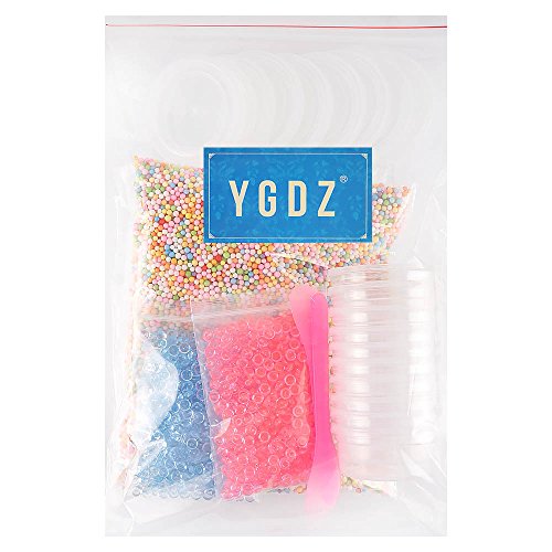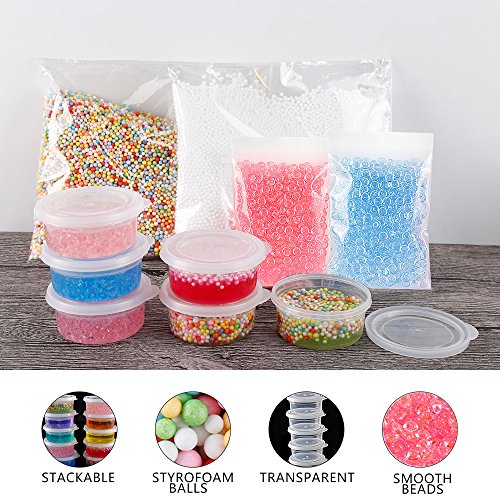 PACKAGE INCLUDES - 2 pack fishbowl slime beads (pink and blue), 2 pack foam balls for slime (multicolor and white), and 10pcs slime storage containers with 2pcs spoon.