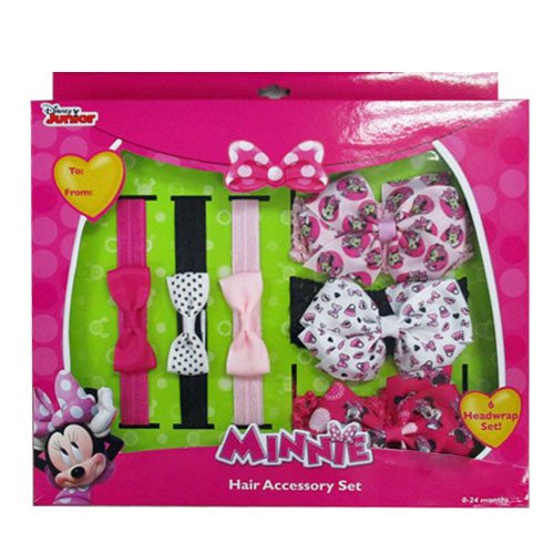 Minnie Mouse box set with 3 printed head wraps with a grosgrain bow, and 2 bow headw wraps with a faux flower. Suitable for all children ages 3 and up. Comes packaged in a box featuring Minnie Mouse.Feature