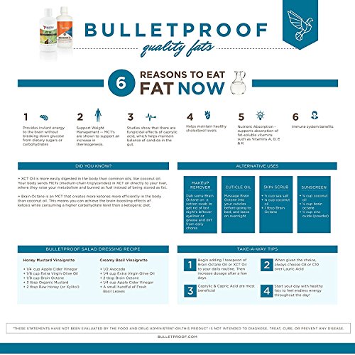 Studio : Bulletproof Publisher : Bulletproof Binding : Misc. Product Description Brain Octane is naturally found in coconut oil in small quantities, and we concentrate it to provide you with the purest energy source possible. Brain Octane rapidly provides mental and physical energy, powering your day by keeping you satisfied and free from food cravings. Add it to your daily routine, and experience the state of high performance. As soon as you consume Brain Octane, it is rapidly absorbed and changed into ketone bodies - providing instant energy to the brain without breaking down glucose from sugars or carbohydrates. Brain Octane produces 4x the ketone energy of plain coconut oil, and also supports healthy digestion and immune function. Experience the power of using quality fats for fuel, keeping you full and focused for hours. Contains at least 10x the (C8) Caprylic acid (14g) per Tablespoon as in one tablespoon of Coconut oil (1.4g). (These statements have not been evaluated by the food and drug administration. This product is not intended to diagnose, treat, cure, or prevent any disease.) Sourcing: Brain Octane is orangutan friendly. Carefully extracted from 100% pure coconut oil, not palm oil, to protect wild orangutan habitat in Southeast Asia. Not just coconut or MCT oil - Brain Octane is made with only C8 MCTs, which metabolize more efficiently into ketone energy than more common oils with C10 and C12 (Lauric Acid) MCTs. Your body cannot store ketones from Brain Octane as fat; instead it is excreted through your lungs (breath), or kidneys (urine). Brain Octane undergoes our special triple distillation process with only water, heat and pressure to create the cleanest product possible - free from harsh chemicals and solvents. 0