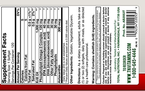 Studio : Total Nutrition Publisher : Total Nutrition Binding : Health and Beauty Product Description Krill are small shrimp-like marine animals that dwell in the deep oceans of the world. Krill Oil is naturally rich in Omega-3 Fatty Acids, Astaxanthin, and Phospholipids for Heart Health. 0