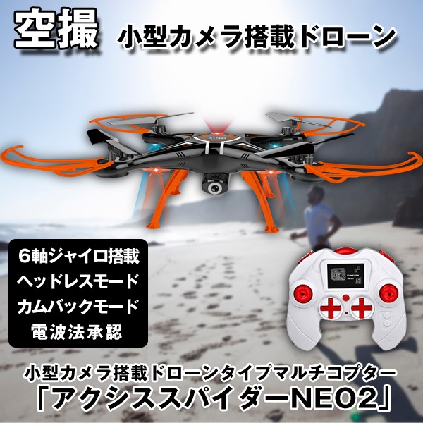小型カメラ付きドローン・・・見たことのない空撮の世界へ!BIGサイズ&高機能・動画&写真撮影可能でこの価格!2.4GHzジャイロ6軸マルチコプターアクシススパイダーNEO2登場!カメラ搭載のドローンタイプマルチコプター!小型カメラ搭載で動画&写真撮影可能!飛行中の圧倒的安定感を保つ【6軸ジャイロ搭載】、距離が離れた時に操作しやすくする【ヘッドレスモード】、操縦者に戻ってくる【カムバックモード】など高機能満載!2.4GHz電波法承認済み。さあ見たこともない空からの景色をおもっきり楽しんでみよう!※中・上級者向けの商品となりますのでドローン・ラジコンヘリ・マルチコプター等を初めて操縦の方は、基本的な操作をマスターしてから操作願います。 (初期不良以外の返品は受け付けれませんのでご了承ください。) 必ず説明書をお読みになり飛行させて下さい。 ■商品サイズ:約320mm H95mm