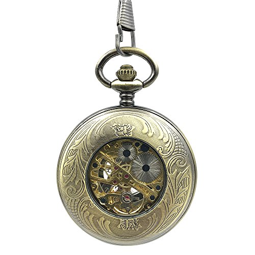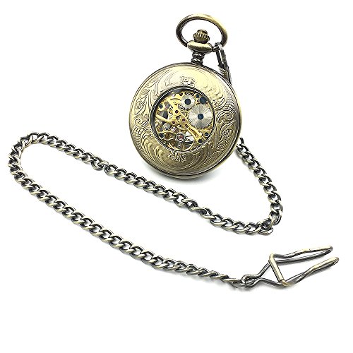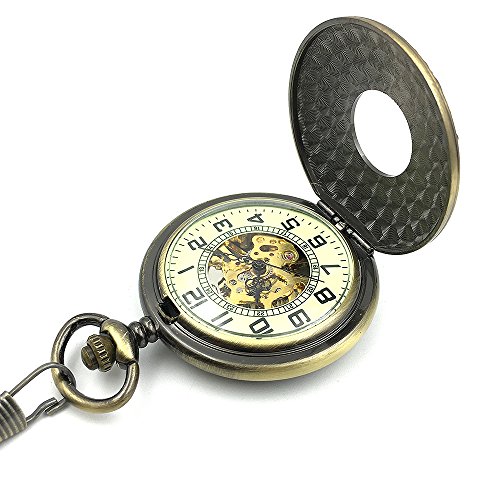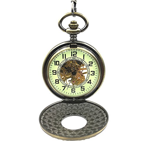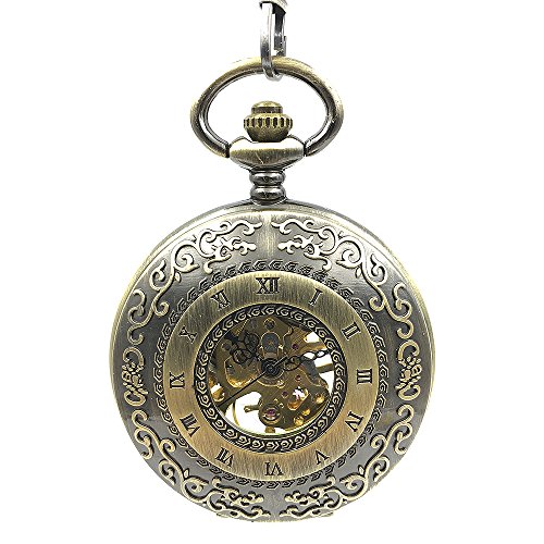 -. Title : Bronze Tone Roman Number Hollow Case Classic Half Hunter Arabic Dial Mechanical Hand Wind Pocket Watch W/Chain Relogio De Bolso