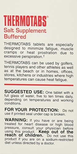 -. Feature : THERMOTABS tablets are especially designed to minimize fatigue, muscle cramps or heat prostration due to excessive perspiration*. / THERMOTABS can be used by golfers, tennis players and other athletes as well as at the beach or in homes, offices, stores, kitchens or industries where high temperatures can cause heat fatigue. / Each tablet contains 452 mg sodium chloride.