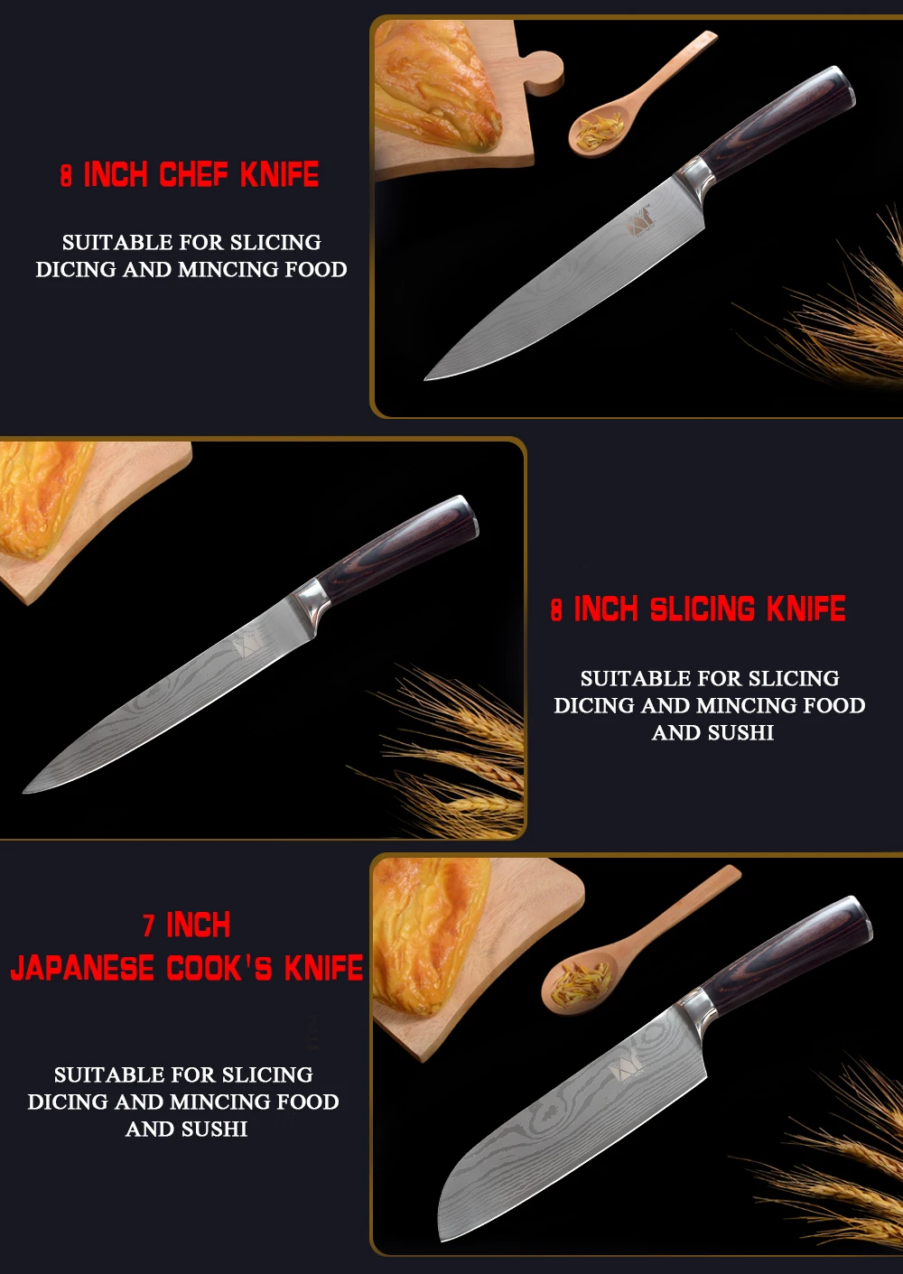 Knife Size:3.5 inch 5 inch 5 inch 7 inch 8 inch 8 inch