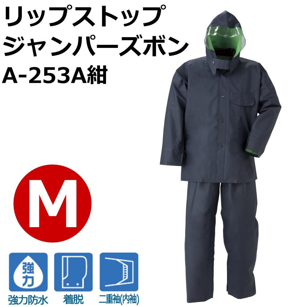 フードは取り外しが可能です。二重構造の袖口で、雨水の侵入をしっかりと防ぎます。 製造国:中国 素材・材質:ナイロンからみ織両面ビニール セット内容:ジャケット、パンツ ※サプライヤー直送品 ご注文後3~4営業日後の出荷となります【商品名】スミクラ リップストップ ジャンパーズボン A-253A紺 M