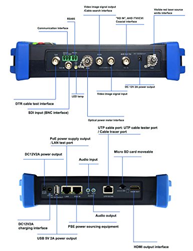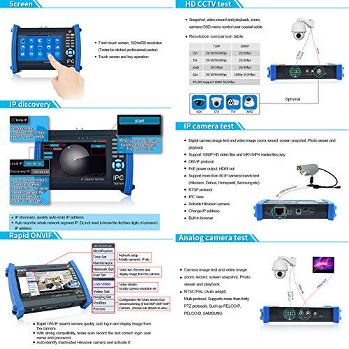 -. Feature : ★ Full Functions: 9 in 1- Digital Multi meter (M)+ Optical Power Meter (O) + Visual Fault Locator (V) + TDR Cable Tester (T) + IP + Analog (A) + SDI (S) + TVI (H) + CVI Tester / ★ 7 inch 1024 x 600 capacitive touch screen with OSD menu, combining touch screen control and physical buttons, with a 7.4V 6500 mAh lithium Polymer battery, working time up to 16 hours, a good friend for engineers. / ★ Built in Wi-Fi, can receive image from wireless camera, as well as ONVIF and customized IP cameras. Compatible with H.264/MPEG4/MJPEG IP cameras, such as Dahua, HIKVISION, and ACTI Customized service is available. / ★ 4GB Micro SD card included, Snapshout function allows to save the image as a JPG file in the SD card; Video image digital zoom to view the image in greater detail; Support more than 30 protocols, such as Pelco-P, Pelco-D, Samsung etc. / ★ 100% QC and test of this IPC tester, comes with 60 days money back and 2 Years warranty.