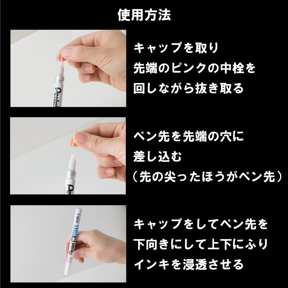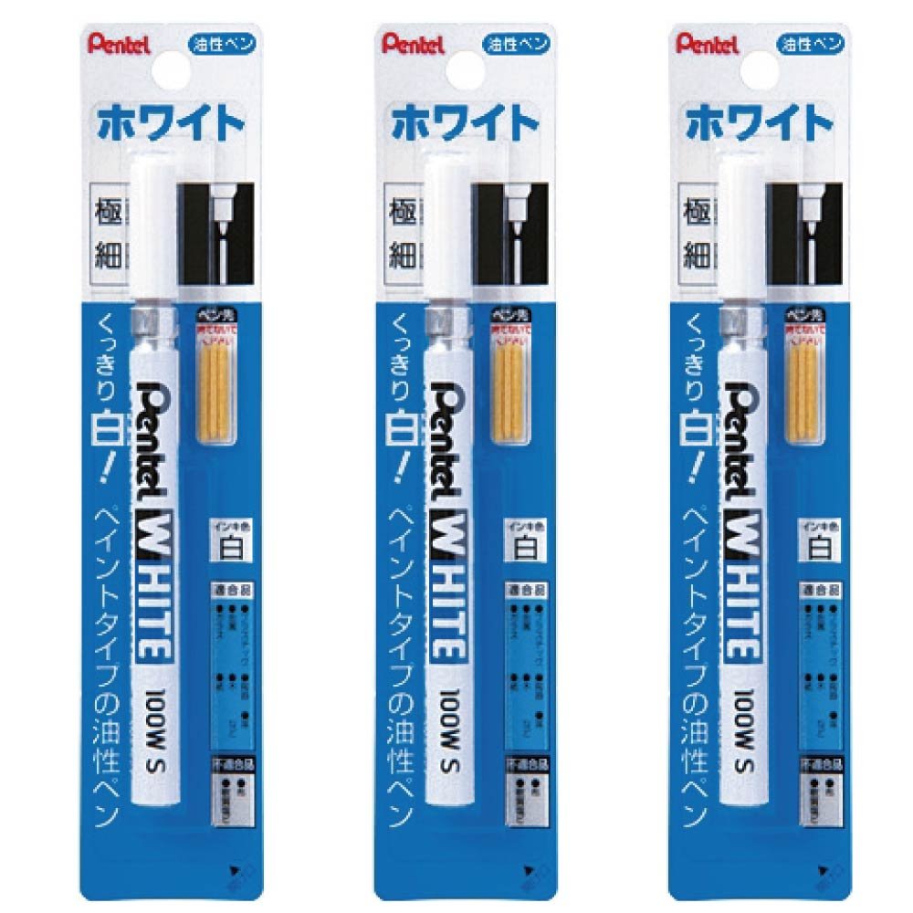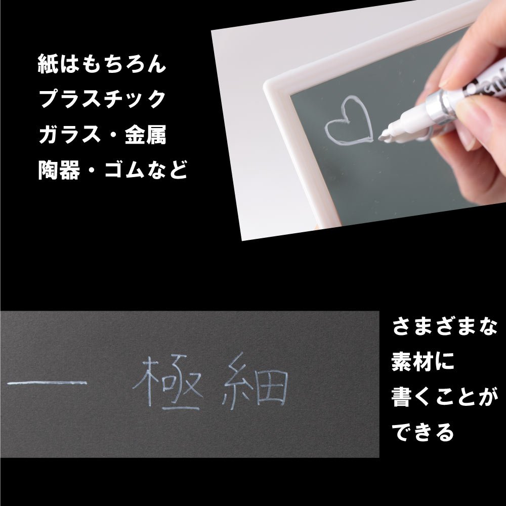 A paint type pen that can also write white on non absorbing surfaces such as iron and resin.