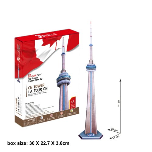 -. Author : Varios -. Binding : Paperback -. Brand : CubicFun -. EAN : 6944588201098 -. Feature : Includes booklet about the CN tower in several languages / 48 pieces made from paper and expandable polystyrene foam board / Complies with EN71, ASTM F963 and ISO8124 safety standards / For ages 8+ (difficulty equivalent to 500pc jigsaw puzzle) / No tools or glue required. Finished model is 35" tall by 8" by 6.7" -. IsAdultProduct : 0 -. Label : CubicFun -. Manufacturer : CubicFun -. Model : MC109h -. MPN : MC109h -. PackageQuantity : 1 -. PartNumber : MC109h -. ProductGroup : Toy -. ProductTypeName : TOYS_AND_GAMES -. PublicationDate : 2013 -. Publisher : CubicFun -. Studio : CubicFun -. Title : Canada's National CN Tower 3D Puzzle from Cubic Fun