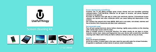 - Feature : No streaks - Cleans and removes grease, dust, oils, fingerprints, smears and dirt - safely and efficiently / Wide use - Best for cleaning the screens: TV, phone, laptop, PC computer, Ipad, Kindle, eyeglasses (or sunglasses), camera, touch screens or any other electronics with a screen. We do not recommend using it for MacBook with protective coating! / Kit contains 1.7 OZ (50ml) Portable Spray Screen Cleaner and 1 Microfiber Polishing Cloth (Anti-Static) 7" x 6"(18 x 15cm) / Alcohol-free, ammonia-free and phosphate-free. Christmas sale now! / 100% Money back guarantee - We are so confident you will like our product that we offer you 30 days money back guarantee!