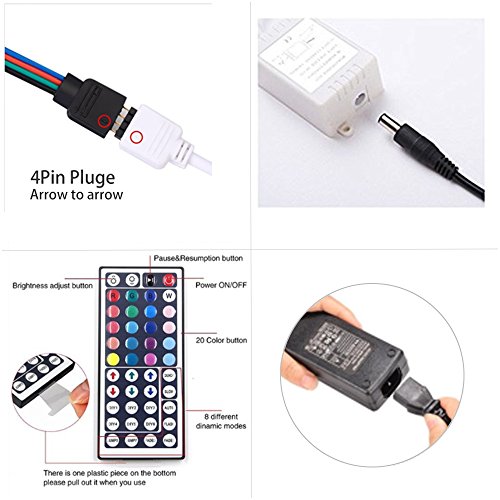 - ALL IN ONE KIT! 5050 SMD flexible RGB roll LED strip lights kit comes with 44 key remote controller, 12V DC power supply, IR control box and connectors. No more accessories are required. IMPORTANT TIPS: If the color doesn't show correctly, please turn off the strips, press 'FADE7', the strips will flash only once. Then turn the strips on, press 'R', if it doesn't show 'red' correctly, please do the step again till it shows color correctly. The 5th picture shows how to use the remote controller.
