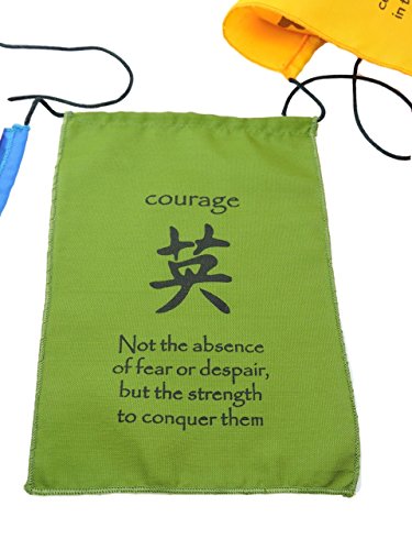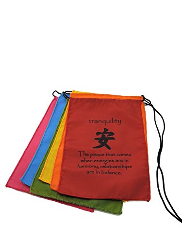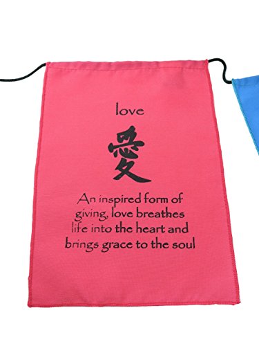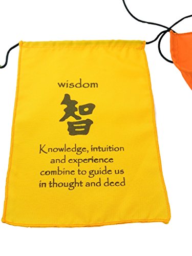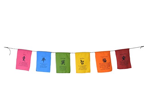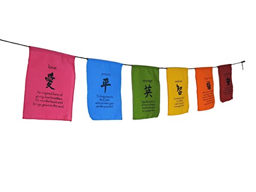 Each flag has a quote the corresponds with the virtue that is written in English and Tibetan. The edges of the flags are surged, making these cotton flags sturdy whether you plan to display them indoors or out