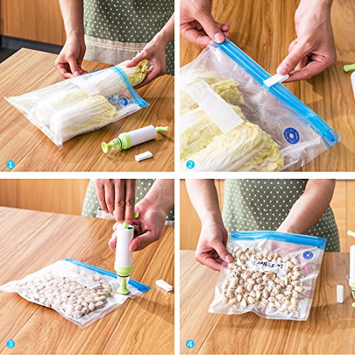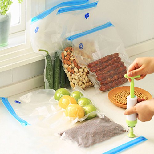 - EASY OPERATING - Few seconds to done the job. Simply click the valve on to any bag. Seal the bag by locking a seal across the top. Next, attach the pump to the valve, and use the manual pump to vacuum out the air. The bag is now vacuum sealed and the food inside will be better preserved.