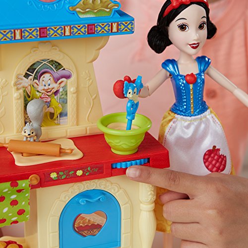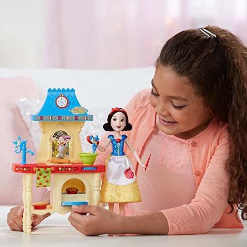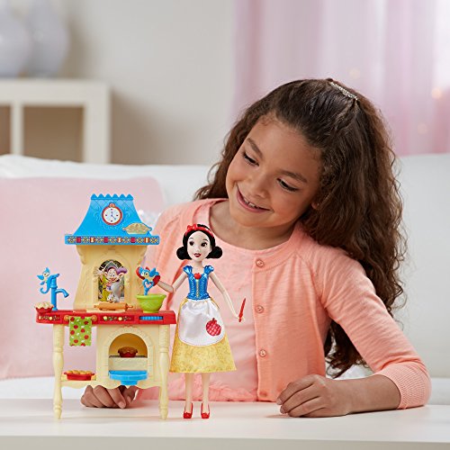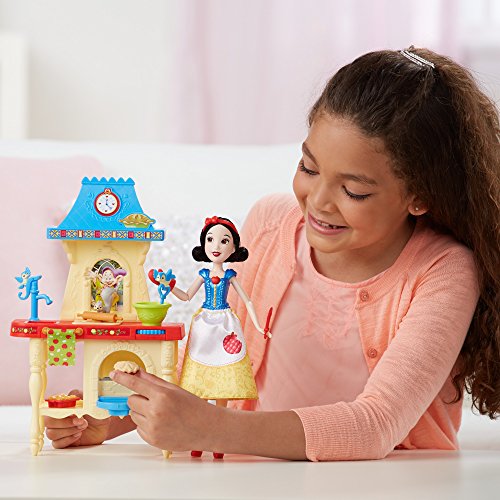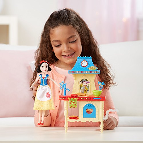 Join Snow White and her animal friends in pretending to make yummy treats! In the Stir 'n Bake Kitchen, girls can imagine Snow White is baking muffins and pies for the dwarfs. Attach the doll to the playset to keep her standing while playing. Roll the dial to activate Snow White's spoon stirring the batter and her squirrel friend rolling pretend dough. The oven has a rotating rack that flips so little dreamers can pretend Snow White's homemade apple pie is baking. Before playing with the set, girls place the cooked pie accessory in the oven and close the door. Then, when they're ready to pretend to bake with Snow White, they can place the uncooked pie accessory in the oven, close the door, and open again to see the baked pie. With the spatula, oven mitt, and muffin pan, girls can play out different and exciting cooking stories in the kitchen with this sweet and caring princess! Copyright Disney. Hasbro and all related terms are trademarks of Hasbro.Feature