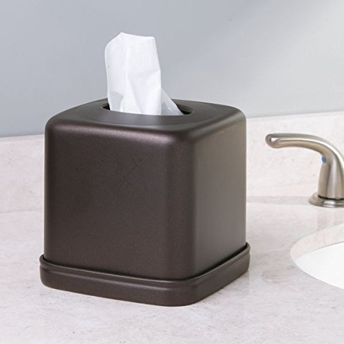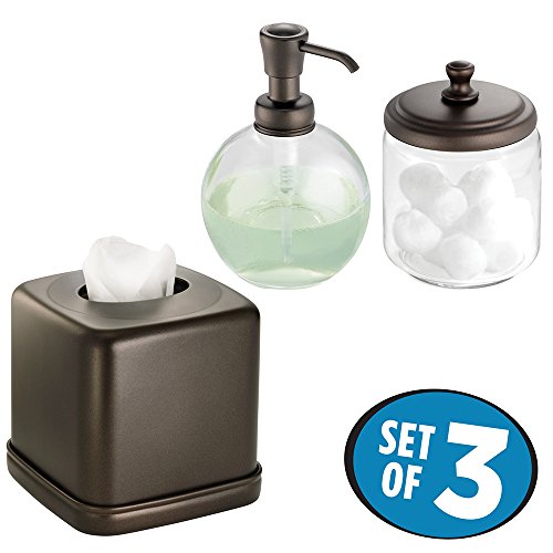mDesign Soap Dispenser Pump, Facial Tissue Box/Cover/Holder, Canister Jar for Cotton Balls, Swabs, Cosmetic Pads - Set of 3, Bronze/Clear