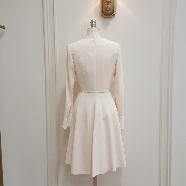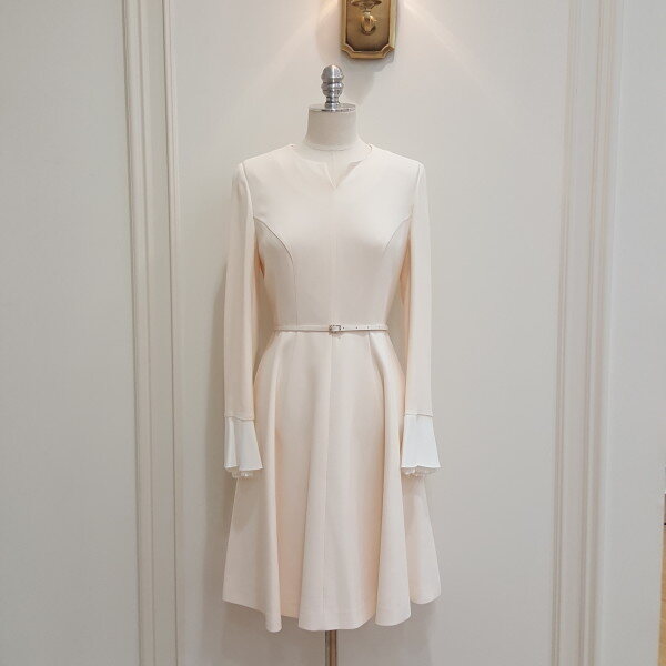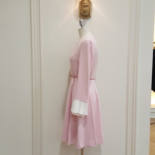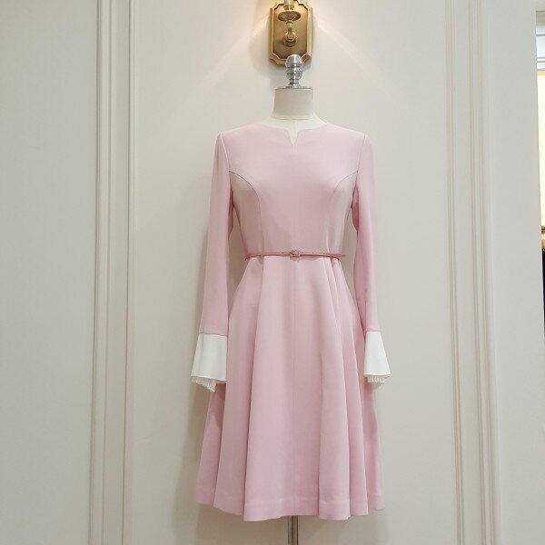 소매의 배색컬러와 레이스장식으로 포인트를 준 원피스. 벨트 세트 상품으로 다양하게 활용가능. 플레어 디자인으로 여성스럽게 착용.