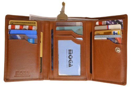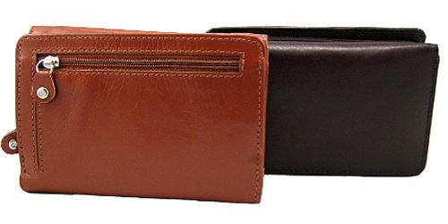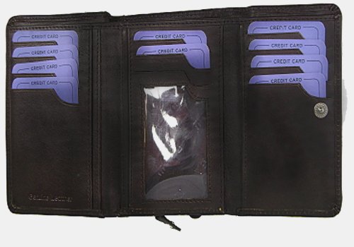 Material: Genuine Leather; Size: 3.75? x 5.25?; Credit Card Slots: 10+; I.D. Window: Yes; Currency Pocket: Divider; Other features: One pocket with snap button enclosure; Two spots for key attachment; One exterior zippered pocket with divided pockets; Additional exterior zippered pocket