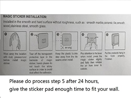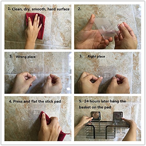 DO: Press and flat the stick pad, squeeze the air out from middle to edge. Waiting for 24 hours then hang the tray or basket on the sticker pads' hooks. DON'T: Not suit for uneven or rough surface,only suit for hard and smooth surface. Keep the sticker pads stay away from the tile gaps and seams.