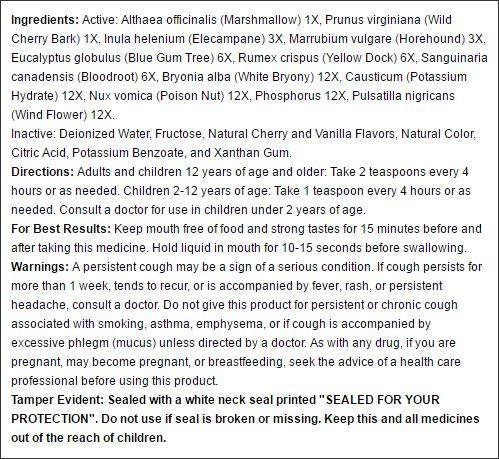 Suggested Use As a dietary supplement adults and children 12 years of age and older, take 2 teaspoons every 4 hours or as needed. Children 2-12 years of age, take 1 teaspoon every 4 hours or as needed. Consult a doctor for use in children under 2 years of age. For Best Results Keep mouth free of food and strong taste for 15 minutes before and after taking. Hold liquid in mouth for 10-15 seconds before swallowing - Or as directed by your healthcare professional. Supplement FactsServing Size: 2 teaspoonsAmount Per Serving% Daily Value***Althea officinalis (Marshmallow) 1X, Prunus virginiana (Wild Cherry Bark) 1X, Inula helenium (Elecampane) 3X, Marrubium vulgare (Horehound) 3X, Eucalyptus globulus (Blue Gum Tree) 6X, Rumex crispus (Yellow Dock) 6X, Sanguinaria canadensis (Blood Root) 6X, Bryonia alba (White Bryony) 12X, Causticum (Potassium Hydrate) 12X, Nux vomica (Poison Nut) 12X, Phosphorus 12X, Pulsatilla (Wind Flower) 12X. ***Percent Daily Values are based on a 2,000 calorie diet