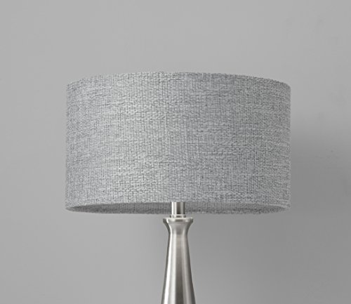 - A smooth, tapered base with a brushed steel finish beautifully reflects the light shining through a light grey textured fabric shade