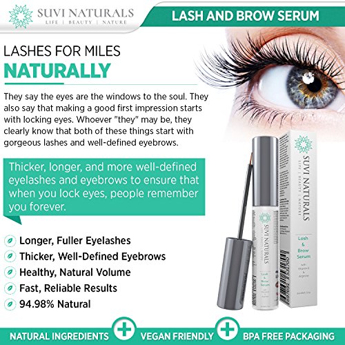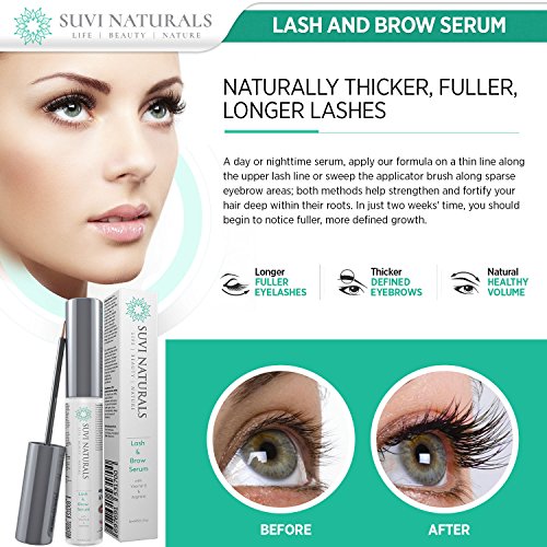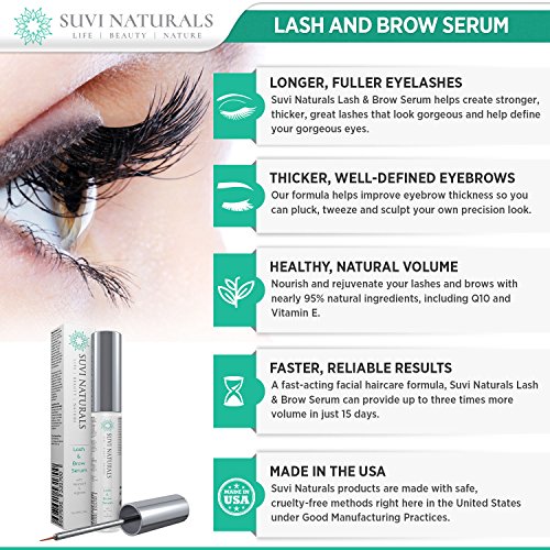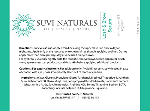 -. Binding : Misc. -. Brand : SUVI NATURALS -. EAN : 0697691531700 -. Feature : LONGER, FULLER EYELASHES - Suvi Naturals Lash & Brow Serum helps create stronger, thicker, great lashes that look gorgeous and help define your gorgeous eyes. / THICKER, WELL-DEFINED EYEBROWS - Our formula helps improve eyebrow thickness so you can pluck, tweeze and sculpt your own precision look. / HEALTHY, NATURAL VOLUME - Nourish and rejuvenate your lashes and brows with nearly 95% natural ingredients, including Q10 and Vitamin E. / FASTER, RELIABLE RESULTS - A fast-acting facial haircare formula, Suvi Naturals Lash & Brow Serum can provide up to three times more volume in just 15 days. / MADE IN THE USA - Suvi Naturals products are made with safe, cruelty-free methods right here in the United States under Good Manufacturing Practices. -. IsAdultProduct : 0 -. Label : SUVI NATURALS -. Manufacturer : SUVI NATURALS -. MPN : PLS023 -. PackageQuantity : 1 -. PartNumber : PLS023 -. ProductGroup : Beauty -. ProductTypeName : BEAUTY -. Publisher : SUVI NATURALS -. Studio : SUVI NATURALS -. Title : Suvi Naturals Lash & Eyebrow Serum – Achieve Luscious Length and Thicker, Fuller Growth – Natural Formula with Vitamin E & Arginine, 0.17 lf. oz -. UPC : 697691531700