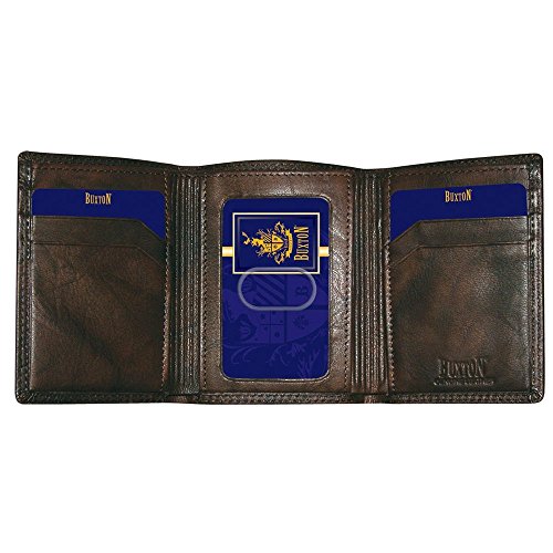 Studio : Buxton Men's Furnishings Publisher : Buxton Men's Furnishings Binding : Apparel Product Description Genuine oil tanned crunch leather, two row stitch detail hunt three-fold features a lined currency section with divider, 6 credit card slots, 2 utility slip pockets and I.D. Window. 0