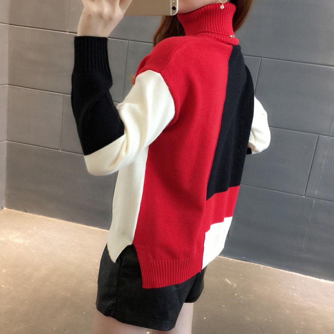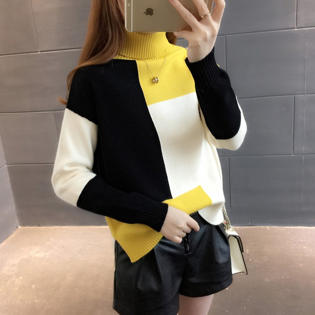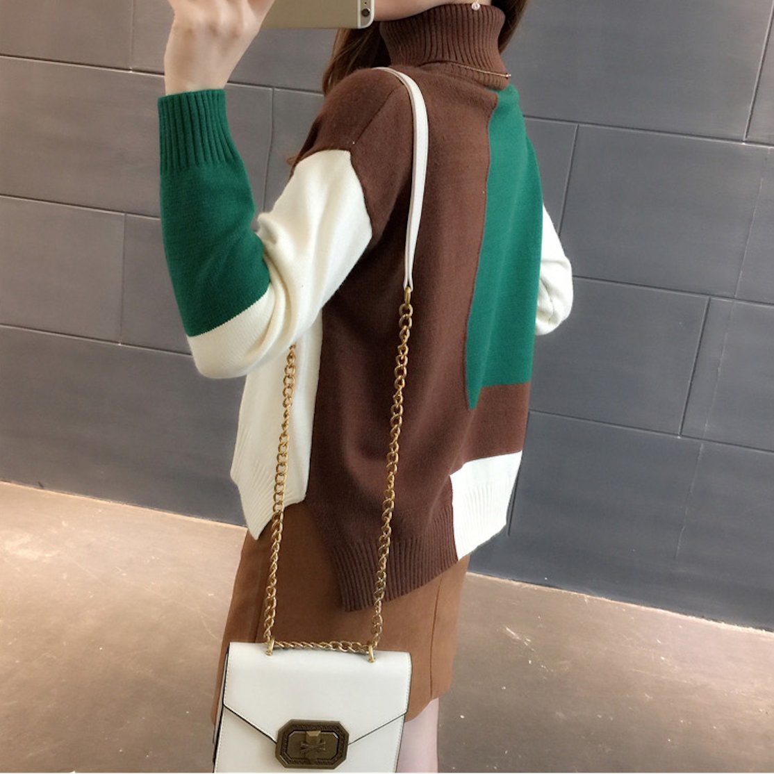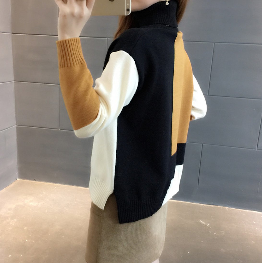 大人女子 きれいめ リブ切替 カラー配色 タートル ニット バイカラー スリット 秋冬 トップス 通勤 ハイネック ドロップショルダー フェミニン