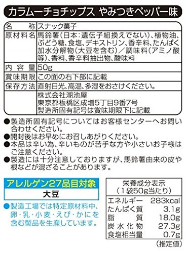 原材料:馬鈴薯(日本:遺伝子組換えでない)、植物油、ぶどう糖、食塩、デキストリン、香辛料、たんぱく加水分解物(大豆を含む)/調味料(アミノ酸等)、香料、香辛料抽出物、酸味料