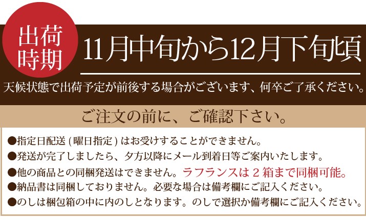 | 同梱について | こちらの商品は産地直送となるため、他商品との同梱はできかねます。ラフランスは2箱まで同梱可能です。ご了承ください。 |