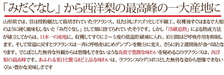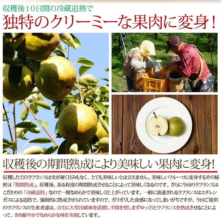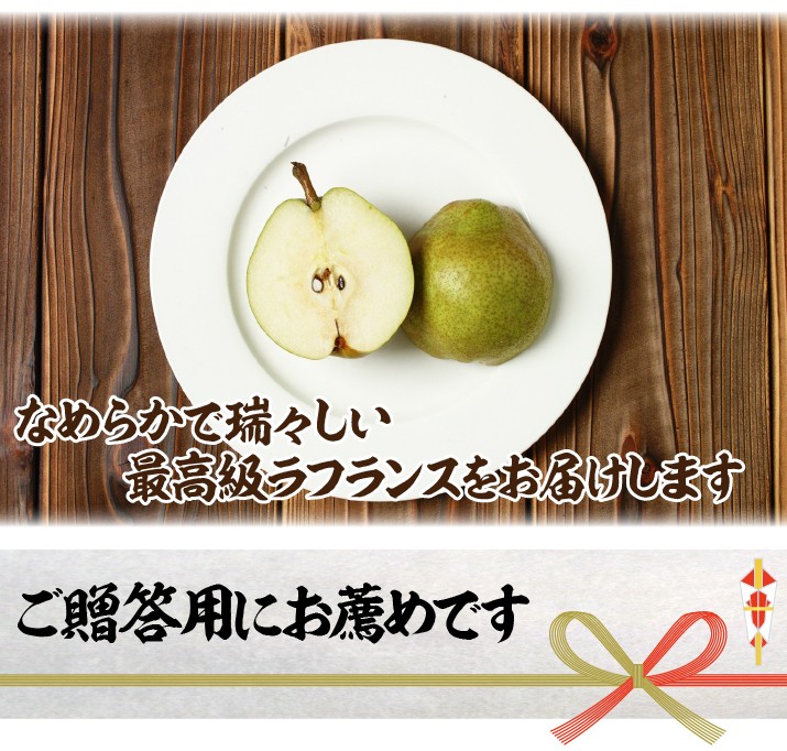 | 保存方法 お召し上がり方 | 常温で食べ頃の期日まで保管してください。(暖かいところですと早く熟成します、寒いところですと熟成が遅れる場合がございます。) ラフランスの肩やお尻部分を触って柔らかく感じたら冷蔵庫に1~2時間程冷やしていただくと美味しく召し上がれます。 |