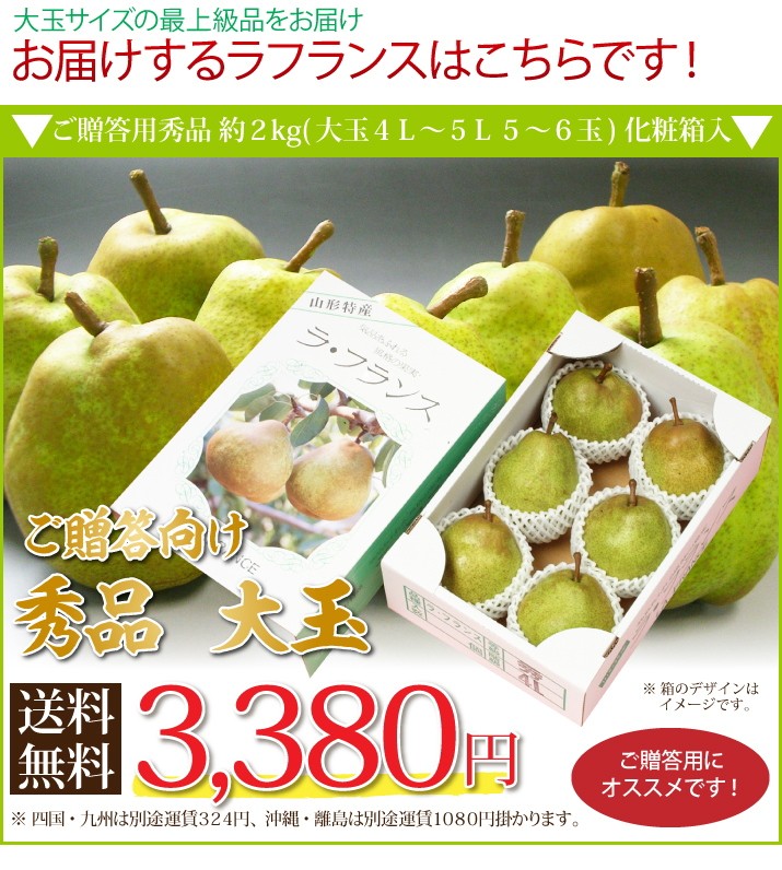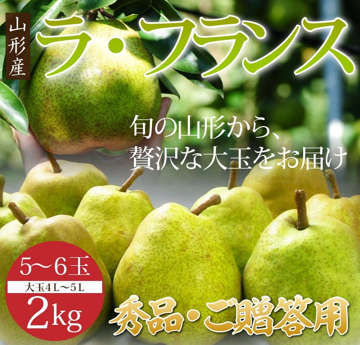 | 商品内容 | ■ご贈答用ラ・フランス秀品約2kg前後(大玉4L~5L)5~6玉 化粧箱入り ■産地:山形県 |