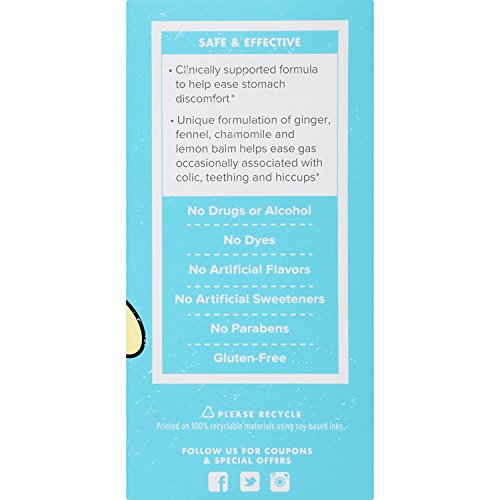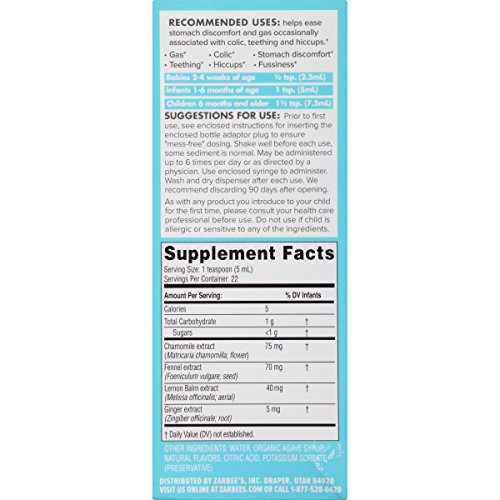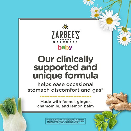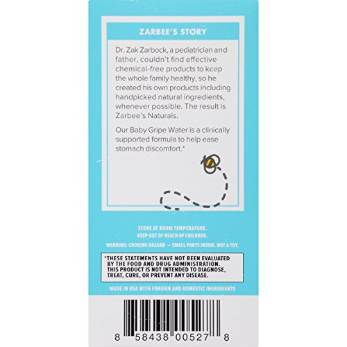 Help ease your baby's occasional stomach discomfort and gas* with Zarbee's Naturals Baby Gripe Water. This clinically supported formula is made with ginger, fennel, chamomile, and lemon balm to help ease occasional stomach discomfort and gas associated with colic, fussiness and hiccups.* Zarbee's Naturals Gripe Water is the first and only clinically supported gripe water formula in the United States, and it is pediatrician recommended for infants. Founded by a pediatrician and father looking for a healthy and chemical-free alternative for his family, Zarbee's Naturals Baby Gripe Water is made with carefully-sourced, wholesome ingredients, with no artificial sweeteners or flavors, drugs, alcohol, parabens, gluten, or dyes.Feature