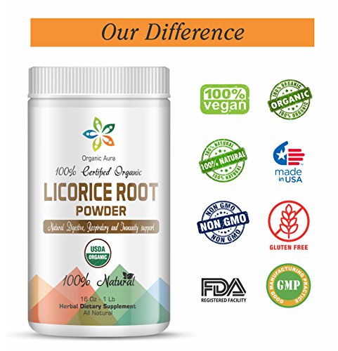 -. Feature : CERTIFIED ORGANIC LICORICE POWDER - 1Lb. 100% All Natural, Fresh and Pure. Natural Superfood. OPTIMAL FOR SIMPLE SUPPLEMENTATION - Raw and Original. Natural source to help smooth breathing, clear mucus congestion, healthy reproductive system and digestion. Enhances Immunity and Overall health system. In a triple protected container. / Natural Respiratory and Digestive Support. A TRULY NATURAL SOLUTION. Organic Aura Licorice powder is truly all natural and Ayurveda grade. We never add artificial colors, flavors, sweeteners, preservatives or fillers and additives to our products, making it a true natural remedy for those who want to use licorice supplements for variety of health benefits and increasing over-all health aura. / MADE IN THE USA - GMP and FDA certified facility. QUALITY YOU CAN COUNT ON We only manufacture our products in the USA at a facility that is GMP, FDA, and NFS certified ensuring that every batch is pure, potent and of great quality and free of contaminants. / 1 Lb - 16 Oz of Certified Organic Raw Licorice Root Powder in a TRIPLE PROTECTED AND EASY TO USE CONTAINER. All our products are laboratory tested and certified in USA. We also send you certificate of analysis, origin and test results. EMPOWERING LIFE and SPREADING HOPE: We donate 10% of profit from your purchase to St Jude's Research Hospital and Childrens Hospital. / AN IDEAL ADDITION TO YOUR HEALTHY DIET Organic Aura licorice root powder is 100% Pure and Fresh and Original made from top quality licorice roots from single source, grown by traditional organic farming. NON GMO, GLUTEN FREE, VEGAN, ORGANIC, KOSHER and AYURVEDA QUALITY.