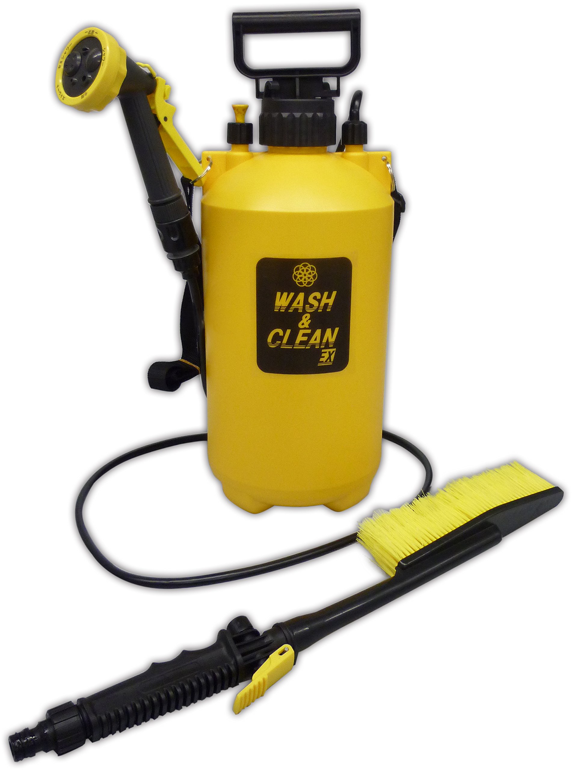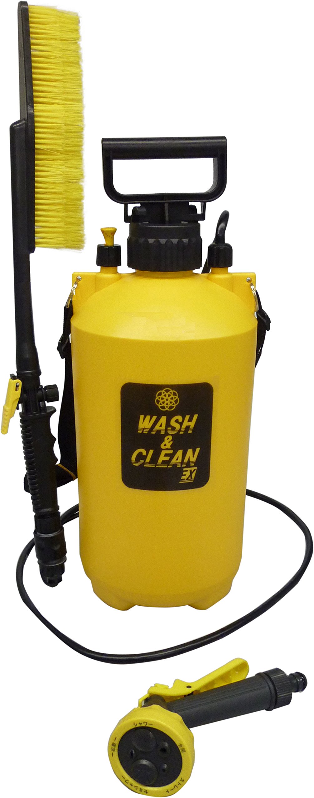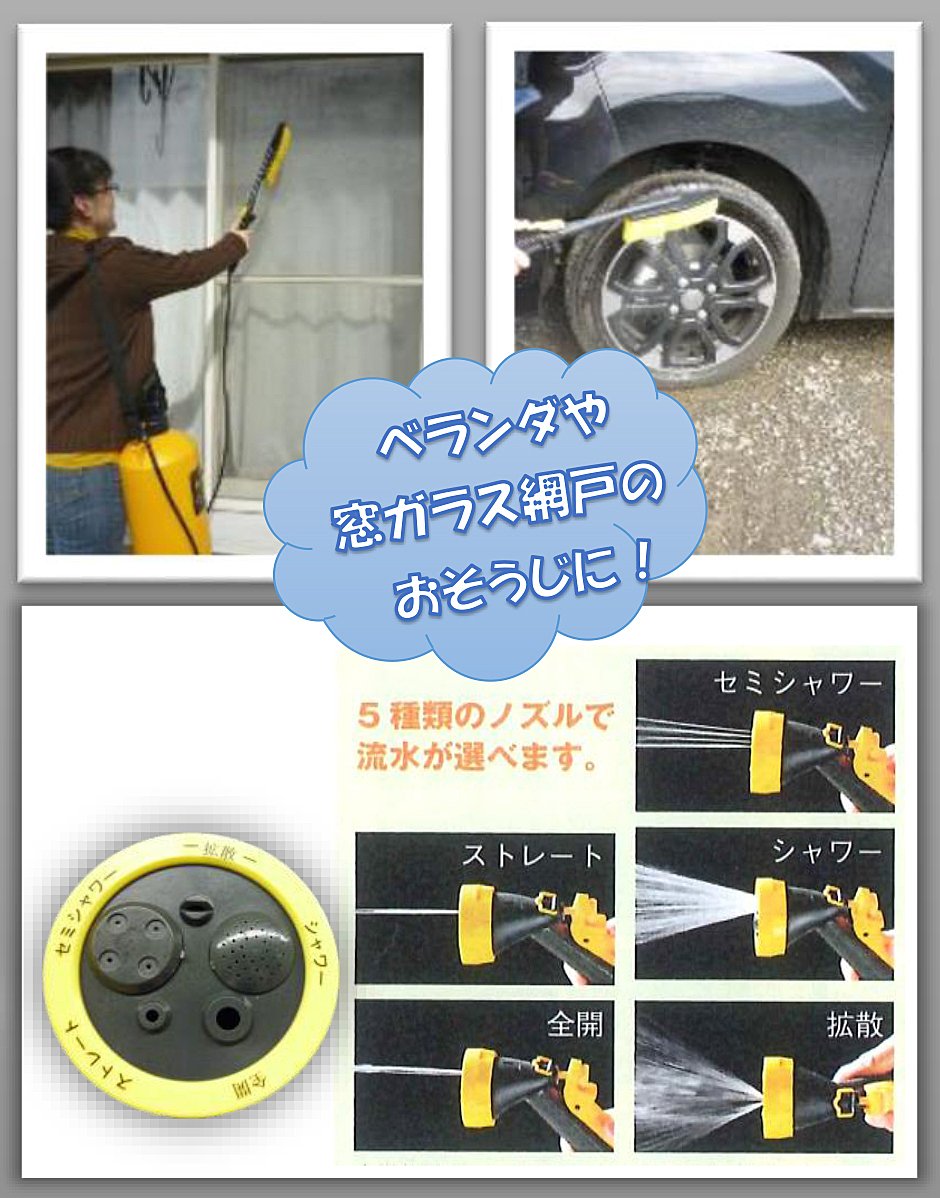 With shower head which can choose 5 types of water flow and large brush which can wash wide surface and high place.