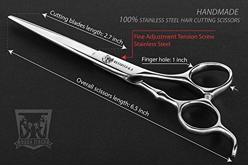 - COMFORTABLE HANDLE AND ADJUSTABLE SCREW FOR THE RIGHT TENSION LEVEL FOR YOU - Non-slip handle, ergonomic shape with integrated finger rest for comfort allowing relax cutting. PREVENTS STRAINS on your fingers, wrists and arms caused by repetitive motion when cutting hair. Fits any thumb and finger allowing easy hand movement and pain-free with optimum control. Rough Stache Hair Shears features an adjustable tension system to cut properly without compromising the cutting while other shears are ben