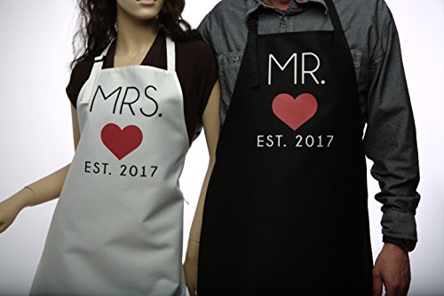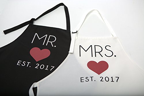 This charming set of couples aprons is sure to inspire a little love, fun, and enjoyment to accompany every meal. There's nothing like rolling up your sleeves in the kitchen and creating a delicious dinner with your new spouse. It helps build strong bonds, allows you to be creative together, and inspires you to do even more with one another. That's why we've created the Kitsch n' Charm Mr. and Mrs. 2017 Couples Kitchen Aprons a 2-piece bib set that lets couples get a little bit messy in the kitchen while they're learning and growing together. Durable, Adjustable and Ready for the Cookbook The cotton/polyester blend makes these bib-front aprons more comfortable and durable when it comes to preparing food. What's more, they're machine washable, so you never have to worry about keeping odors or dried around for very long! Product Details: - Two (2) Kitchen Aprons