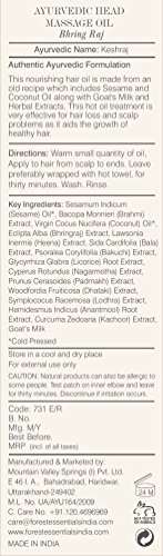 Studio : Forest Essentials Publisher : Forest Essentials Binding : Health and Beauty Product Description When hair loss, pre-mature greying, dry scalp and other such hair and scalp conditions are an issue, it is not helpful to resort to strong and caustic treatments. Such treatments often do more harm than good. This unique Ayurvedic herb enriched head massage oil from Forest Essentials offers gentle yet effective treatment for these conditions using tried and tested traditional Ayurvedic formulas. Blending the best of various traditional formulations, this herb enriched head massage oil is made in a nourishing and moisturizing base of Goats Milk, and the oils of Coconut Sesame. These are rich with vitamins and minerals essential to healthy and abundant hair growth, such as Vitamins E and A, as well as iron, potassium and zinc. In addition, the essential fatty acids of which they are composed are readily absorbed by the skin cells, so they help deliver the healing potential of the hebral extracts directly to the heart of the skin cells. In addition to these oils, Amla oil is included for its detoxify and toning properties. It has high levels of anti-microbial and anti-oxidant properties that eliminate infectious germs which contribute to scalp conditions and hair loss. However, the star ingredient in this luxurious and healing head massage oil is Bhringa Raj, or 'the King of Hair'. Bhringaraj cools the head and stimulates the metabolic activities of the skin cells and hair follicles. This dual action helps relieve the degenerative effects of stress and tension on the hair and scalp as well as encourage new and healthy hair growth. Bhringa Raj naturally encourages the abundant growth of vibrant, strong, and healthy hair through its healing and invigorating effects on each cell of the scalp. Uniting the healing potential of rare Himalayan herbs and oils, this unique Ayurvedic herb enriched head massage oil from Forest Essentials puts a stop to hair loss naturally and without the use of dangerous and caustic synthetic chemicals. Treat yourself to Ayurveda.. 0