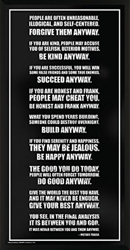 This poster features a quote by the late Mother Teresa, in stylish typography. The quote reads "People are often unreasonable, illogical, and self-centered. Forgive them anyway. If you are kind, people may accuse you of selfish, ulterior motives. Be kind anyway. If you are successful, you will win some false friends and some true enemies. Succeed anyway. If you are honest and frank, people may cheat you. Be honest and frank anyway. What you spend years building, someone could destroy overnight. Build anyway. If you find serenity and happiness, they may be jealous. Be happy anyway. The good you do today, people will often forget tomorrow. Do good anyway. Give the world the best you have, and it may never be enough. Give your best anyway. You see, in the final analysis it is between you and god. It was never between you and them anyway.".Feature